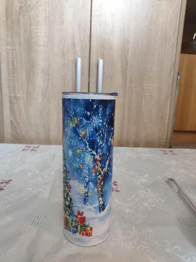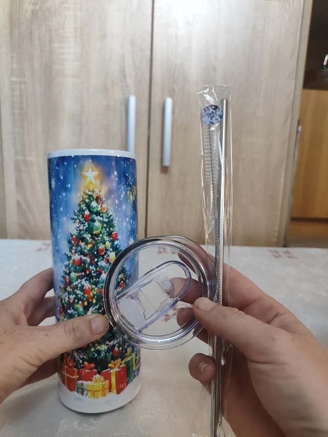 Christbaum Edelstahl Thermobecher 20 oz mit Edelstahlstrohhalm und Reinigungsbürste.
