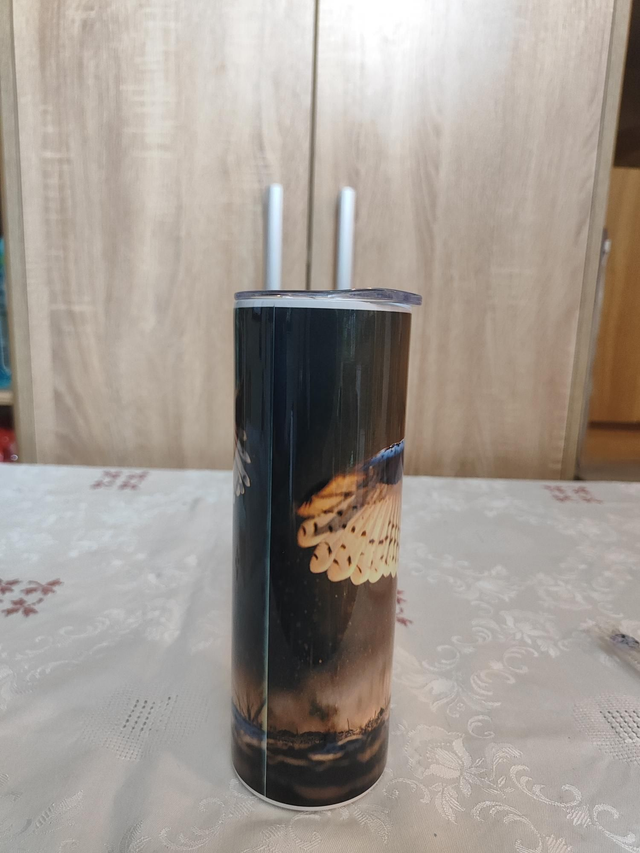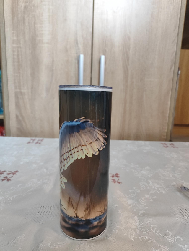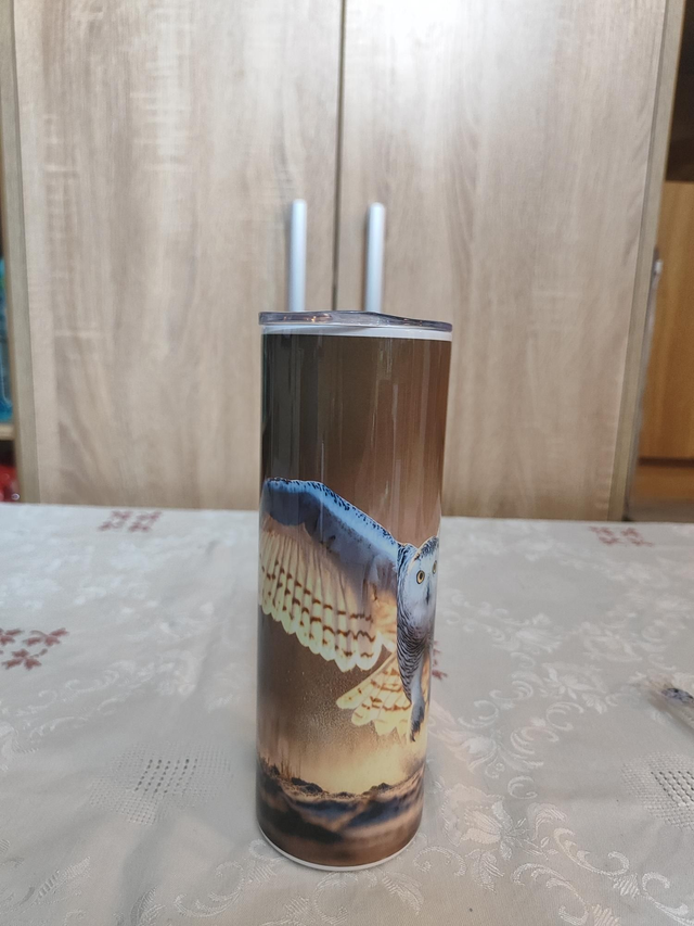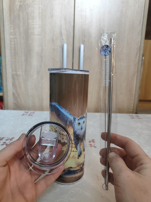 Eule Edelstahl Thermobecher 20 oz mit Edelstahlstrohhalm und Reinigungsbürste.
